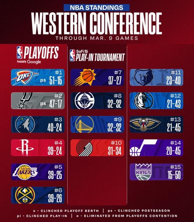 又一个比赛日结束,其中4场与西部球队相关,分别是篮网126-115击败灰熊、雷霆129-126绝杀掘金、勇士116-119不敌爵士、快船126-118轻取尼克斯,最新排名如下: